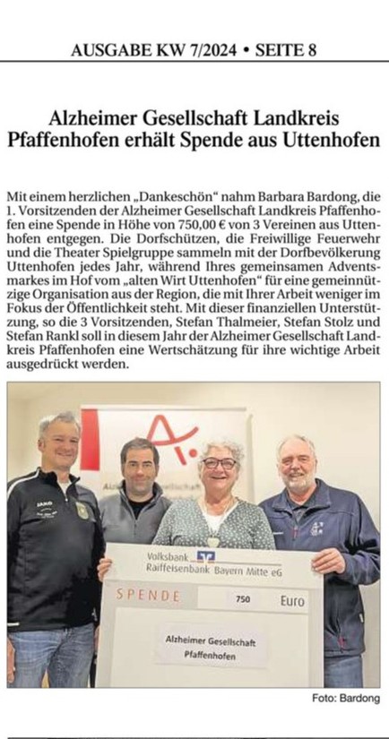 Die Volksbank Raiffeisenbank Bayern Mitte eG hat uns auch in diesem Jahr eine Spende in Höhe von 1.200,00 € zukommen lassen, um damit die „DEMENZ?! „Erste-Hilfe“-Kurse, die wir viermal im Jahr in verschiedenen Orten des Landkreises Pfaffenhofen durchführen, anbieten zu können.
